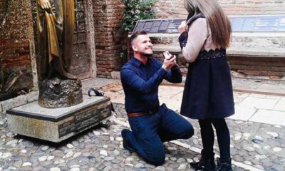Un tânăr din Abrud, student la Universitatea „1 Decembrie 1918” din Alba Iulia, a îngenuncheat lângă Statuia Julietei, din Verona – Italia, pentru a-și cere iubita...