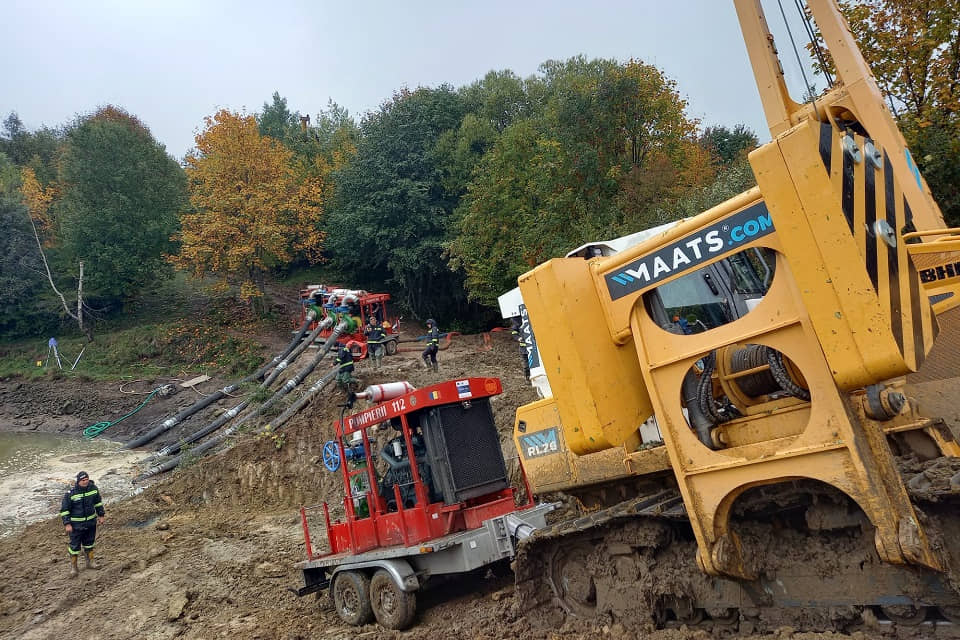 Se lucreaza cu ajutorul unui excavator pentru crearea unei platforme de acces a motopompelor spre interiorul lacului, in aceste momente 2 dintre acestea fiind repozitionate.