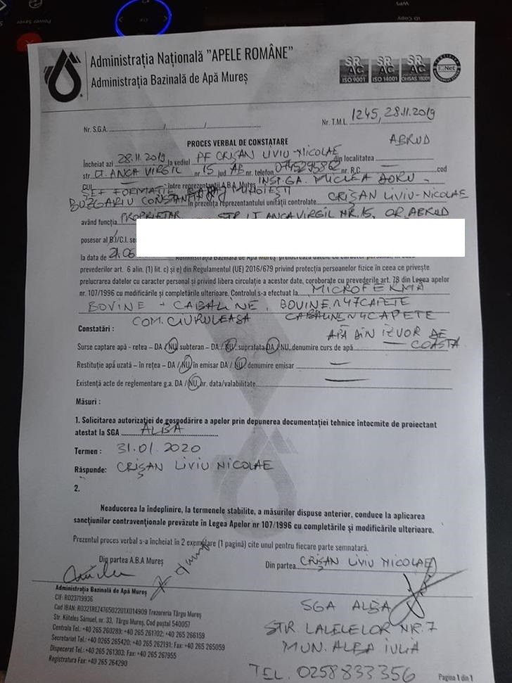 În susținerea celor spuse, fermierul din județul Alba a postat și un proces verbal de constatare prin care reprezentanții zonali ai Administrației Naționale „Apele Române” îi pun în vedere că pentru a folosi apa din izvorul local, fermierul trebuie să obțină o autorizație de gospodărire a apelor.