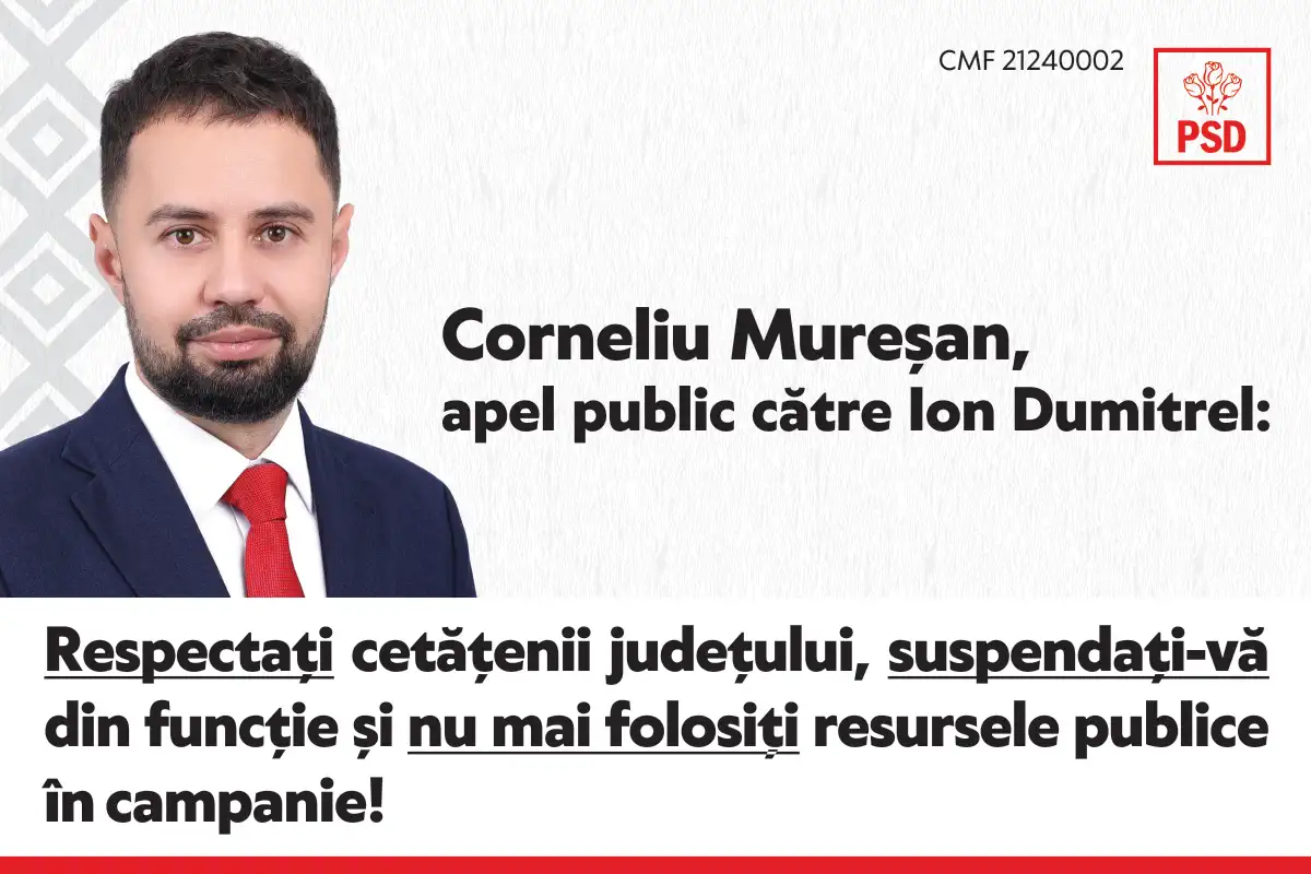Corneliu Mureșan, apel public către Ion Dumitrel: Respectați cetățenii județului, suspendați-vă din funcție și nu mai folosiți resursele publice în campanie!