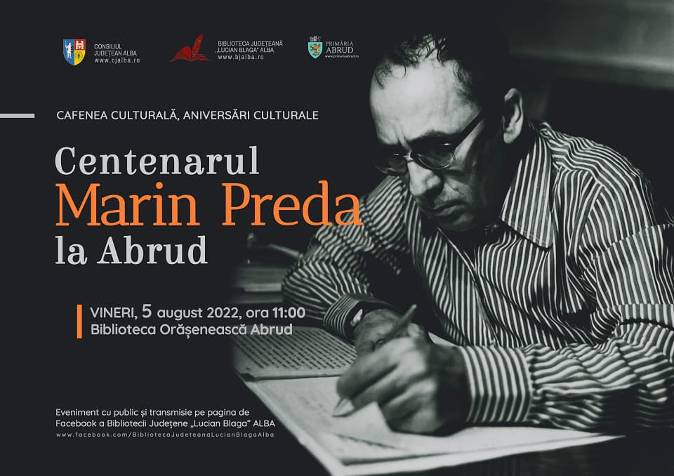 Consiliul Județean Alba și Biblioteca Județeană „Lucian Blaga” Alba vă invită vineri, 5 august 2022, la Abrud. Aici, în parteneriat cu Primăria Orașului Abrud, începând cu ora 11.00, în sala de ședințe a consiliului local, va avea loc evenimentul Centenarul Marin Preda, în cadrul proiectului Cafenea Culturală, Aniversări Culturale.